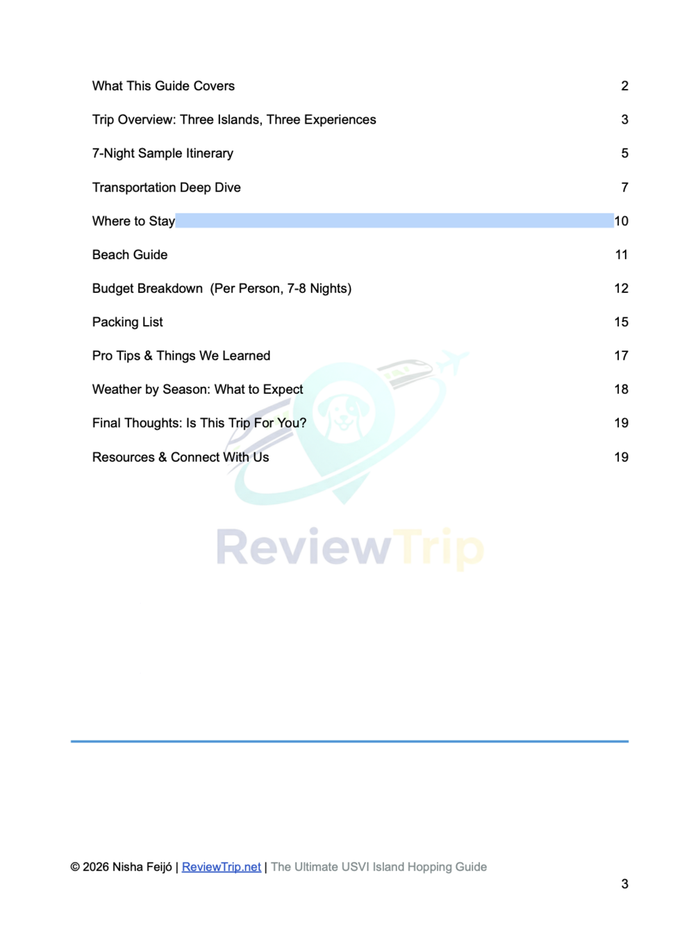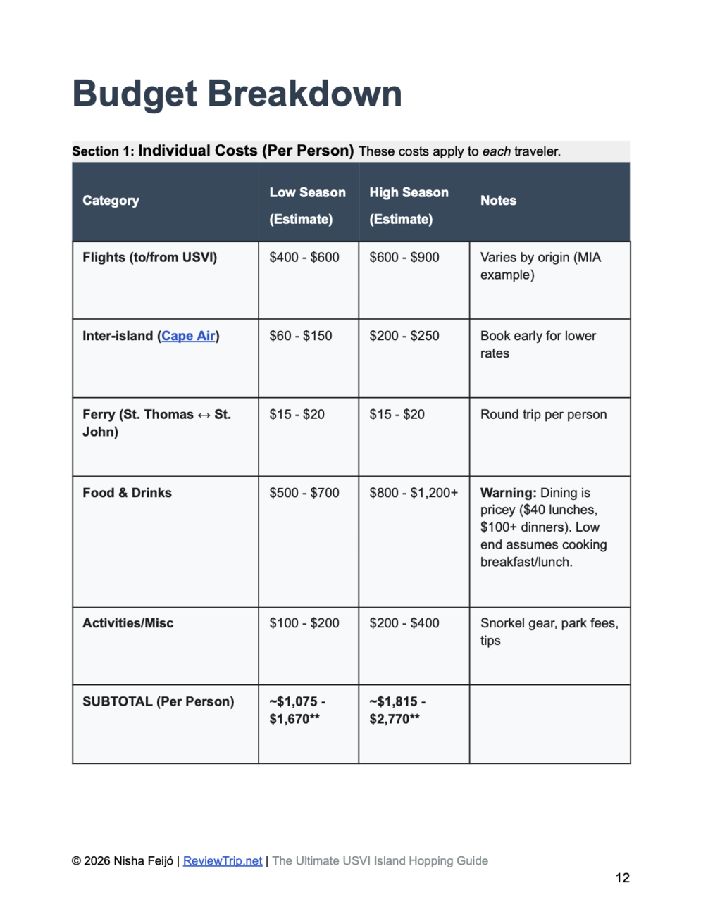A 20-page planning resource with real budgets, logistics, and insider tips for island hopping St. Croix, St. Thomas & St. John. Save $2,000+ by booking independently with honest advice from someone who's actually done this trip.