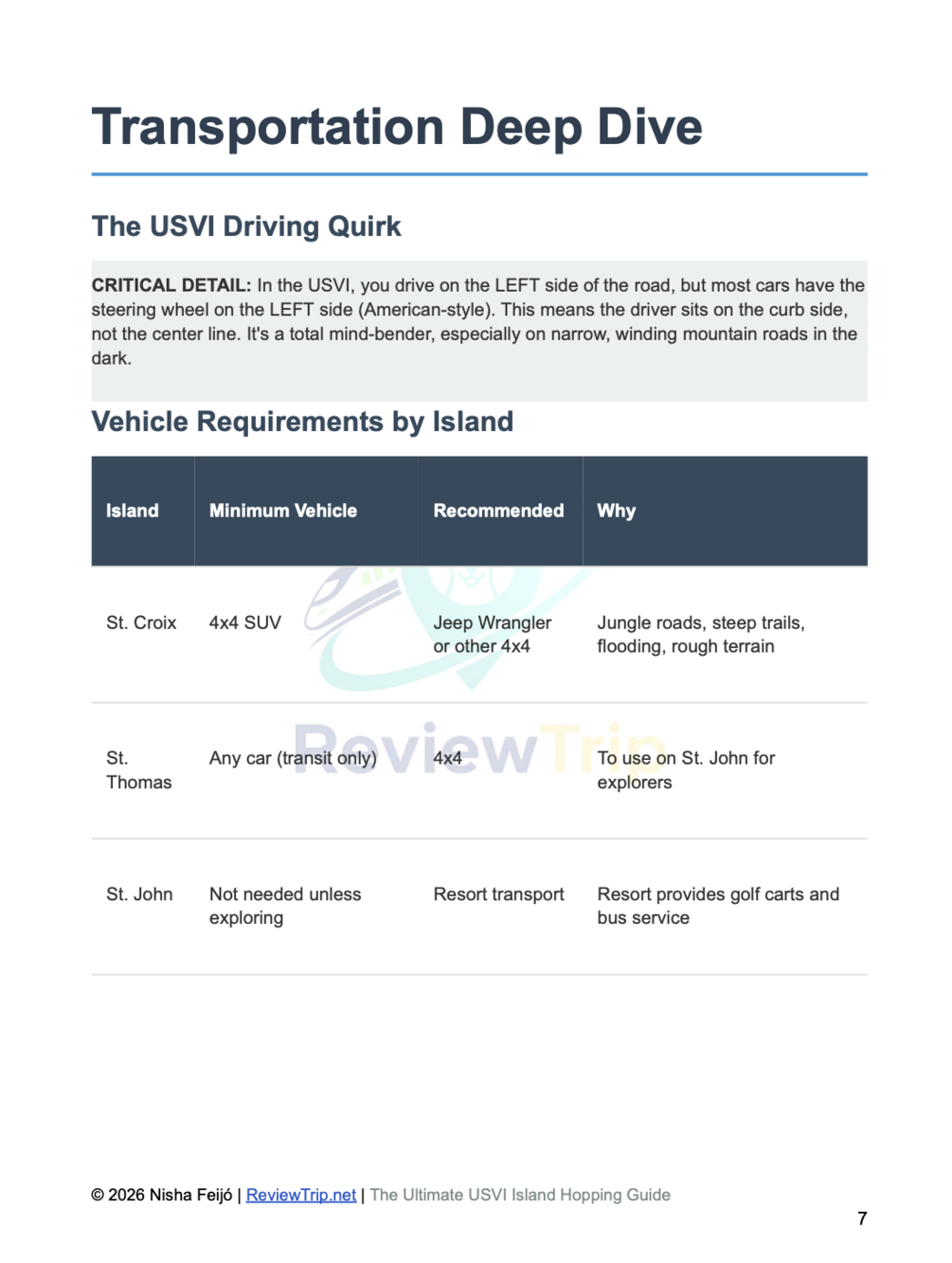 ✅ Transportation Deep Dive — Cape Air vs. Ferry comparison, vehicle requirements by island, the USVI driving quirk explained